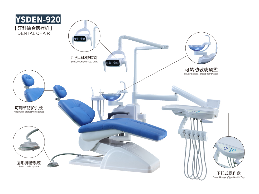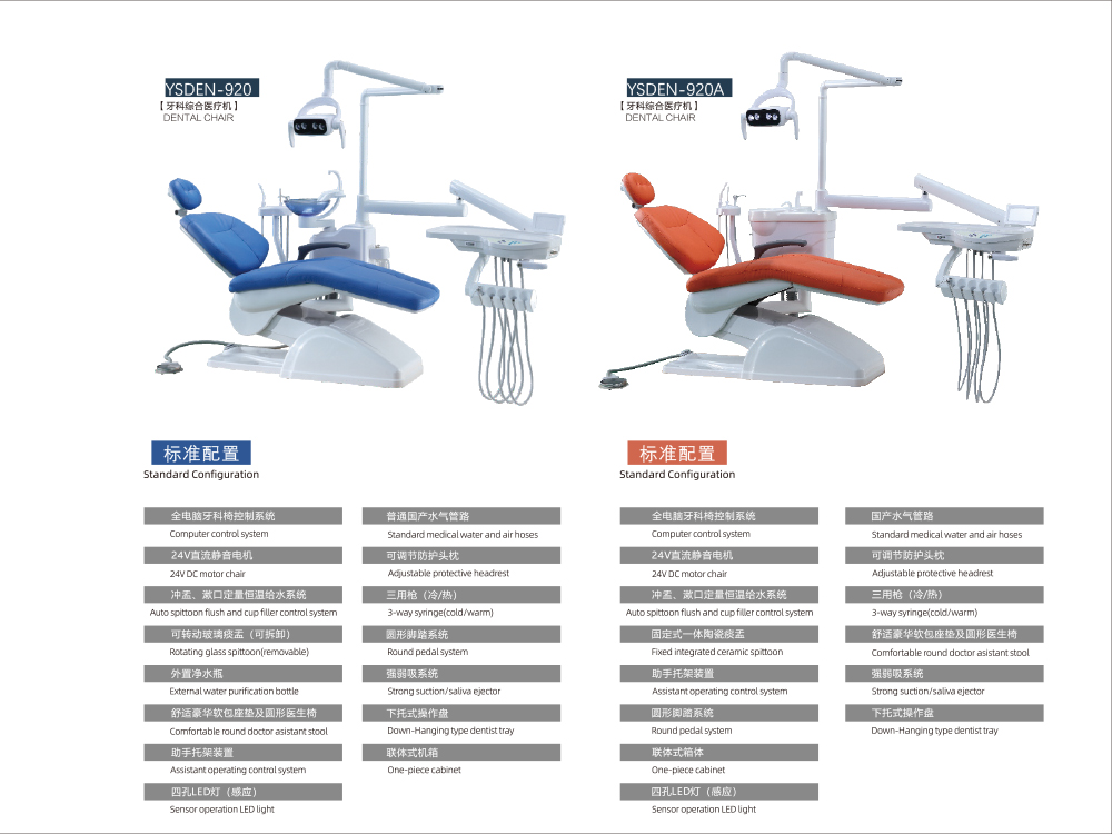 Standard components Computer control system 24V DC motor chair Auto spittoon flush and cup filer sensor control system Rotating glass spittoon(removable) External water purification bottle Comfortable soft doctor stool Assistant operating control system Sensor operation LED light Standard medical water and air hoses Adjustable protective headrest 3-way syringe (cold/warm) Round pedal system Strong suction/salive ejector Down-Hanging type dentist tray One-piece cabinet